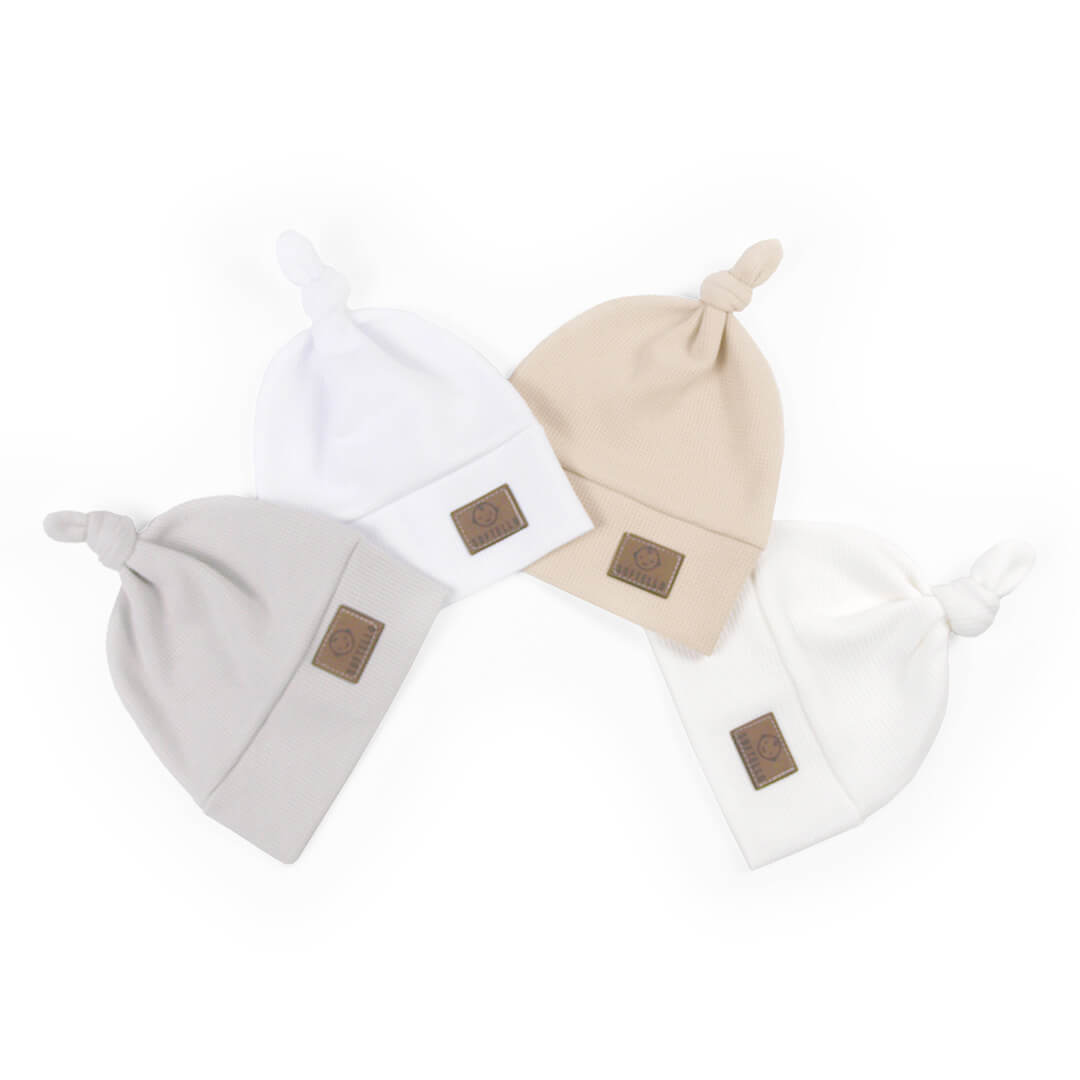 Roztomilá čepička pro miminko s uzlíkem je vyrobena z měkkého, prodyšného materiálu v neutrální bílé barvě. Pletený waflový vzor dodává čepičce stylový a útulný vzhled, zatímco uzlík na vrchu přináší hravý detail.