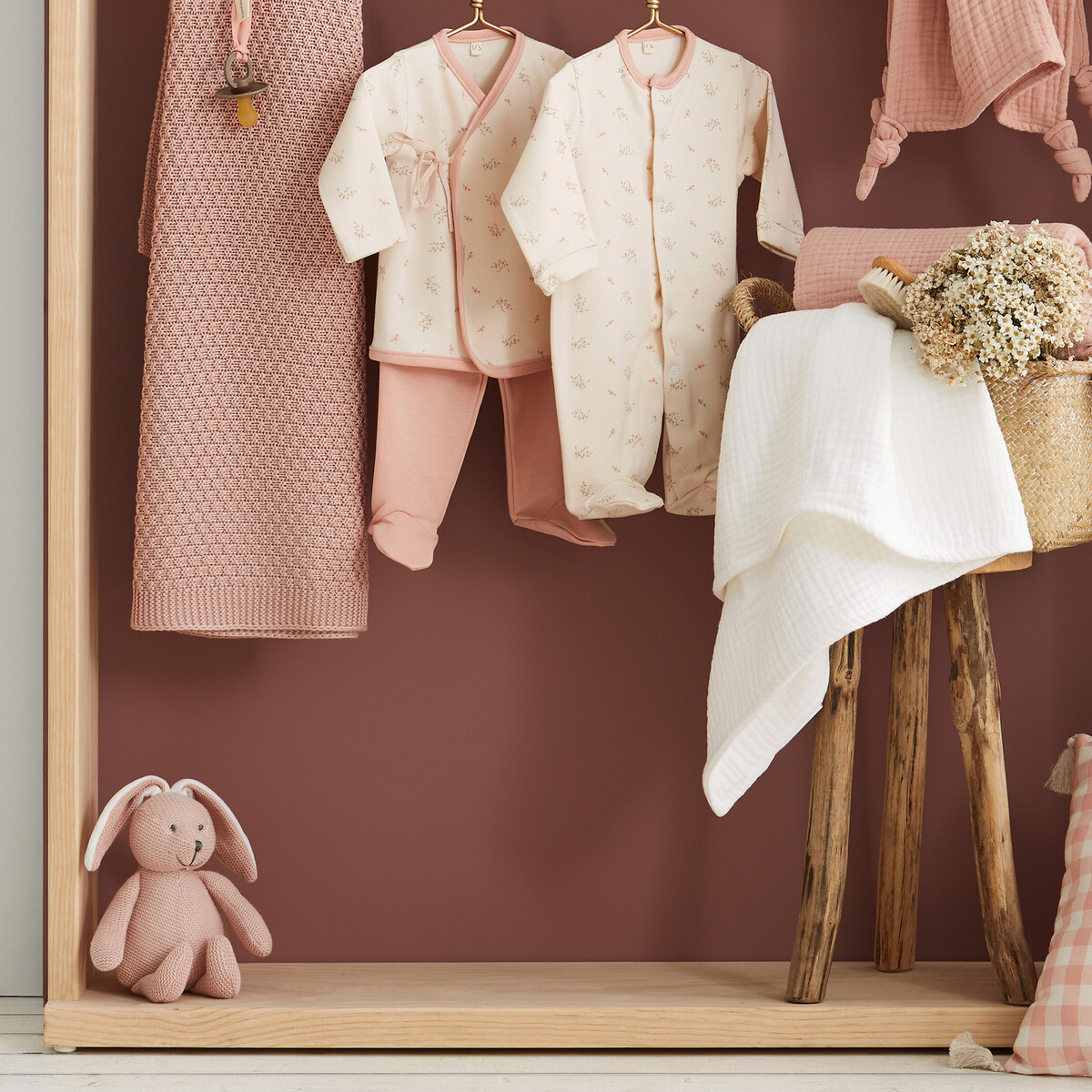 Souprava obsahuje hřejivou pletenou deku vyrobenou z prodyšného, hebkého materiálu, který je šetrný i k nejcitlivější dětské pokožce. Spolu s ní najdete v balení měkoučkého pleteného zajíčka – věrného společníka na mazlení, hraní i usínání.