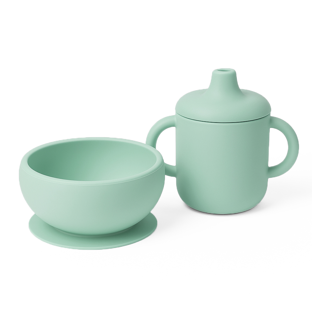 Dětská silikonová sada ke krmení FreeON v zelené barvě je vynikající pomůckou každé maminky. Tvoří ji miska a hrnek s náustkem.