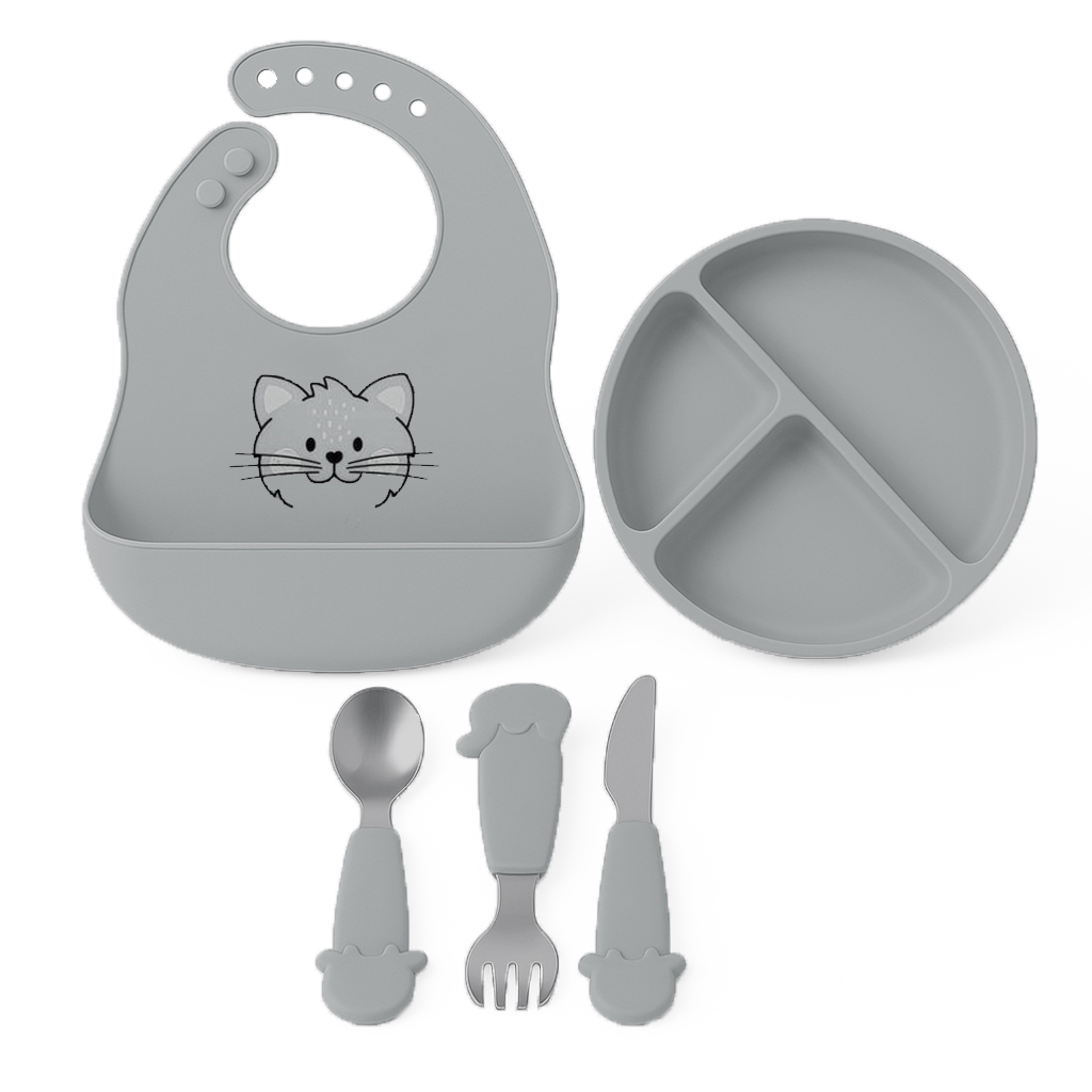 Dětská silikonová sada ke krmení FreeON v šedé barvě je vynikající pomůckou každé maminky. Tvoří ji talíř, příbor a bryndák.