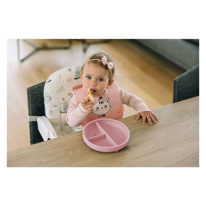 Silikonový talíř od zn. FreeON v růžové barvě je vynikající nástroj pro seznámení vašeho děťátka se samostatným krmením. Miska má ve spodní části podtlakové sání, aby se zabránilo sklouznutí ze stolu. Silikonová miska je vyrobena z vysoce kvalitního potravinářského silikonu, neobsahuje změkčovadla ani BPA a je pro děti naprosto bezpečná. Má tři přihrádky na oddělení potravin. Má průměr 18 cm a výšku 4 cm. Může se používat v mikrovlnné troubě a chladničce (od -30 do 200°C). Čištění je neuvěřitelně jednoduché, jelikož je vhodná do myčky nádobí.