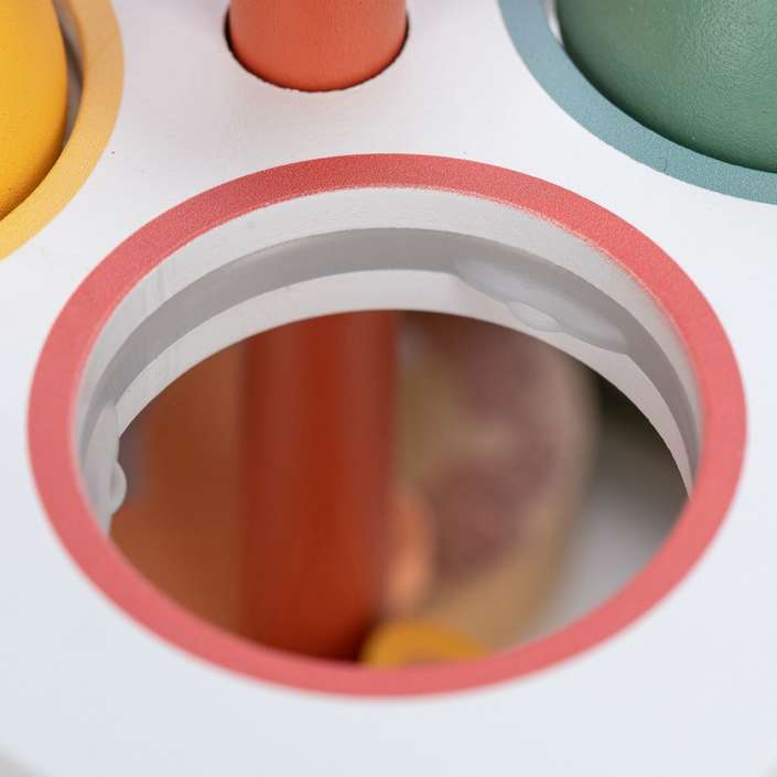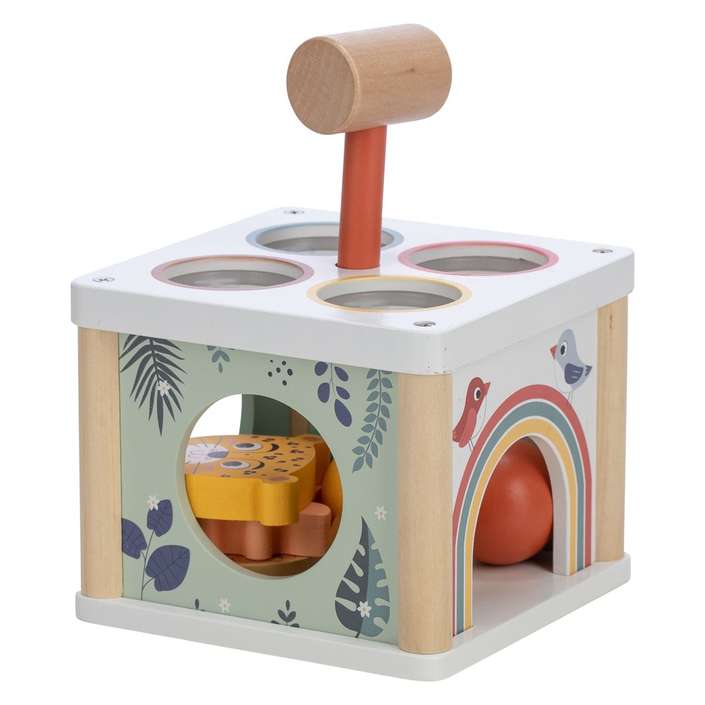 Kladívkem udeřte do míčků ukrytých uvnitř domečku. Domeček zároveň obsahuje postavičky, které může dítě protlačit skrz příslušné otvory. Jedná se o výbornou hračku pro rozvoj jemné motoriky, koordinace ruka-oko a prostorového vnímání. Vhodná je pro děti od 12 měsíců.
