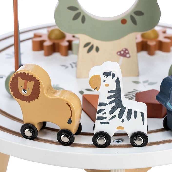 - 🐘 Pohyblivé figurky zvířat (žirafa, lev a slon) – dají se odpojit, takže si s nimi dítě může hrát i samostatně.