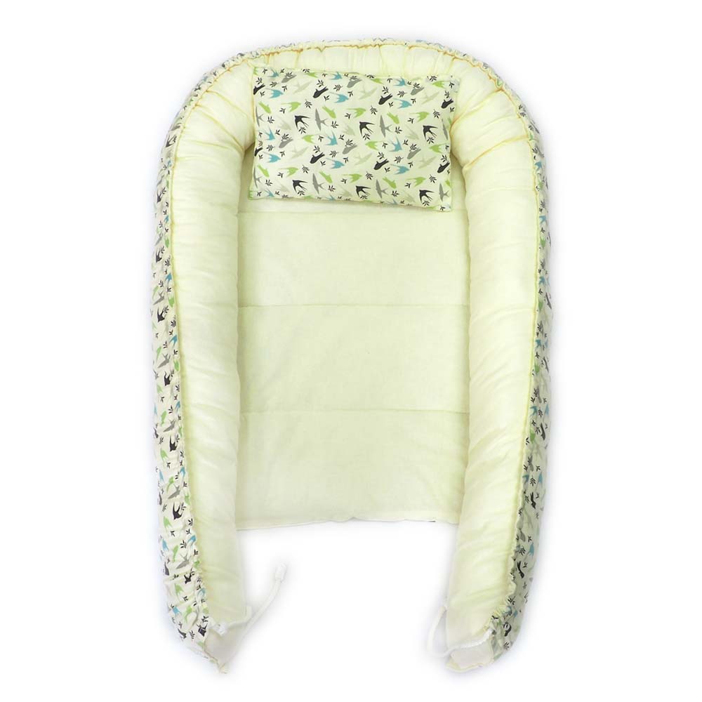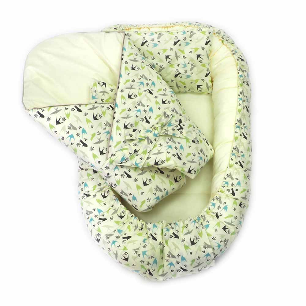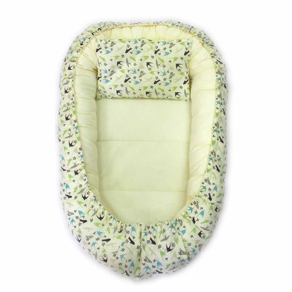 Limitovaná edice kolekce vlaštovka. Vnitřní strana tohoto měkoučkého hnízda je ušita v přírodní máslově žlutém jednobarevném designu, přičemž vnější stranu hnízda tvoří limitovaná edice látky se vzorem vlaštovka. Hnízdečko je rostoucí, což znamená, že si jeho velikost můžete regulovat podle potřeby díky stahovacím šňůrkám. Vázání je překryto elegantním látkovým pásem v dekoru hnízdečka a je na suchý zip. K hnízdečku je dodáván také mini polštářek. (Hnízdo nemá vyjímatelnou ložnou plochu).