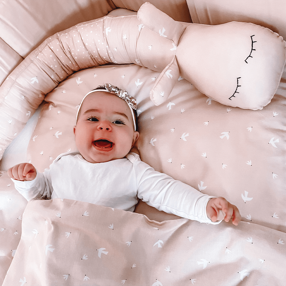 Šnek je vyroben z certifikovaného originálního bavlněného saténu a vyplněn je certifikovaným kuličkovým dutým vláknem. Vhodný i pro nejmenší děti od 0 měs.