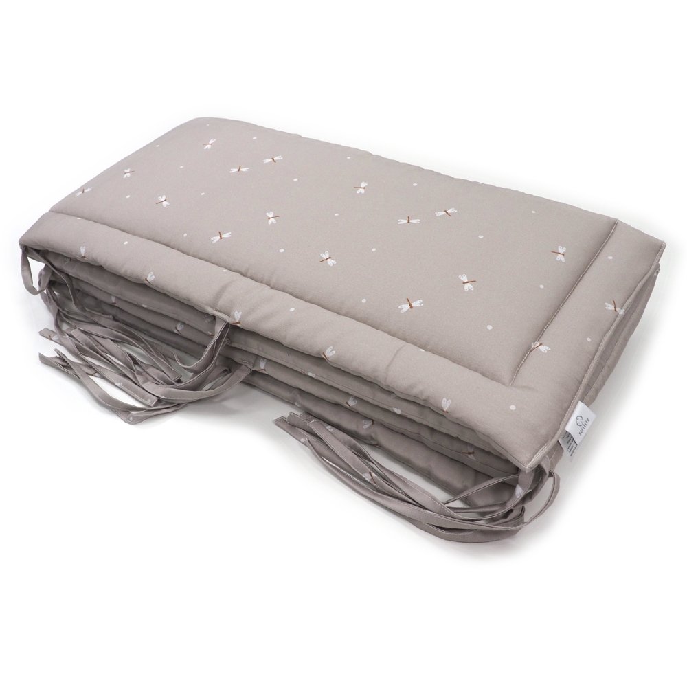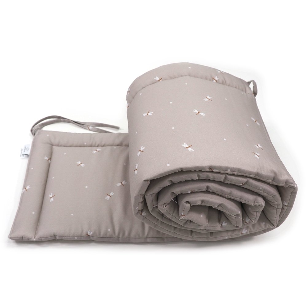 Mantinel SOFTELLO šedohnědé vážky je vyroben z kvalitního bavlněného saténu, který je potlačen naším vlastním originálním designem. Tento materiál je na dotek ve srovnání s klasickou bavlnou mnohem příjemnější a hebčí. Má tvar dlouhého obdélníku o rozměru 30x240cm, který o postýlku pohodlně upevníte více šňůrkami.