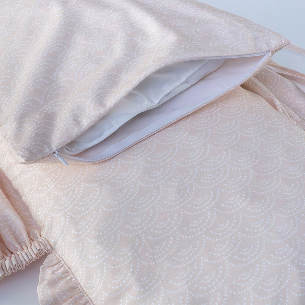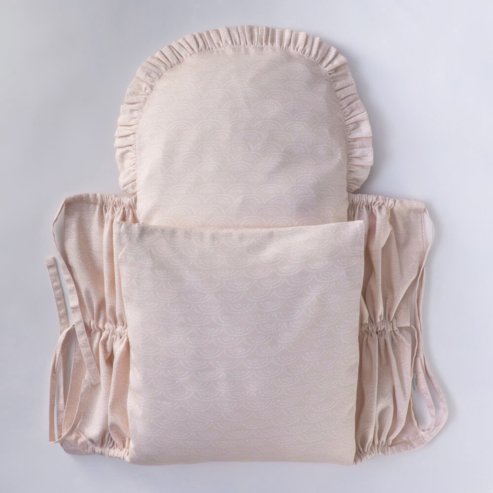 Peřinka má elegantní obdélníkový tvar se zaobleným okrajem, který zdobí jemný volánek. Zavazování na tři pevně všité šňůrky zaručí, že vše zůstane bezpečně na svém místě.