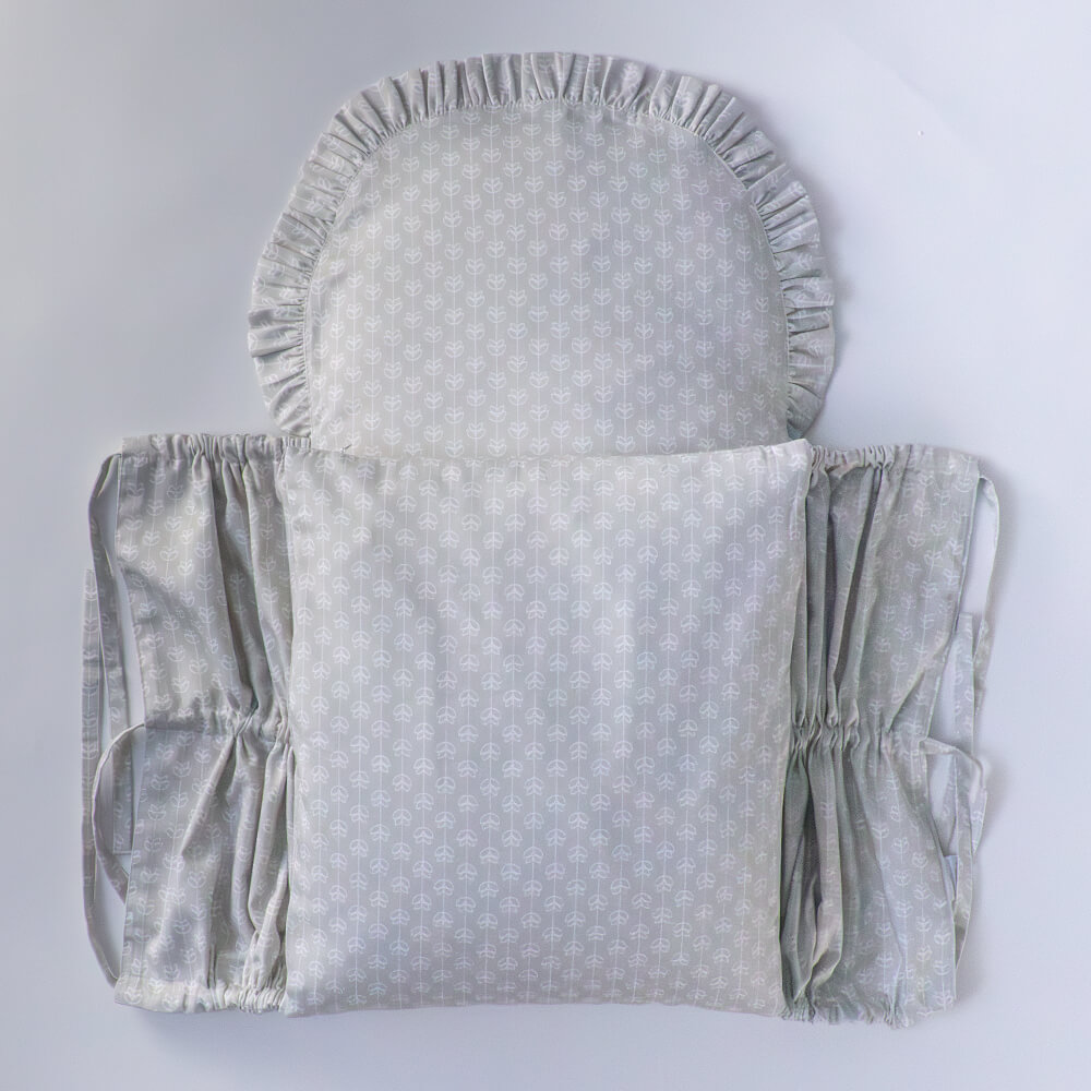 Peřinka má elegantní obdélníkový tvar se zaobleným okrajem, který zdobí jemný volánek. Zavazování na tři pevně všité šňůrky zaručí, že vše zůstane bezpečně na svém místě.