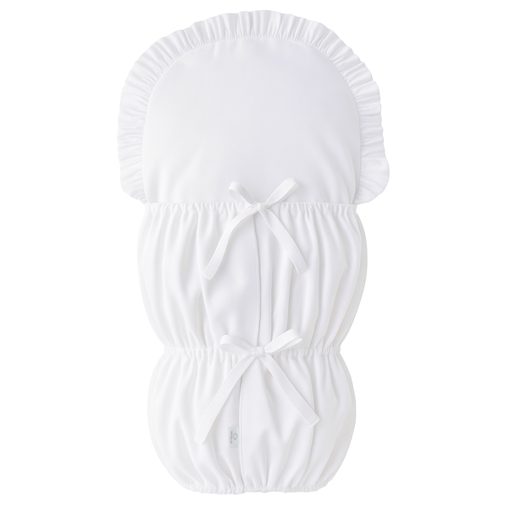 Peřinka má elegantní obdélníkový tvar se zaobleným okrajem, který zdobí jemný volánek. Zavazování na tři pevně všité šňůrky zaručí, že vše zůstane bezpečně na svém místě.
