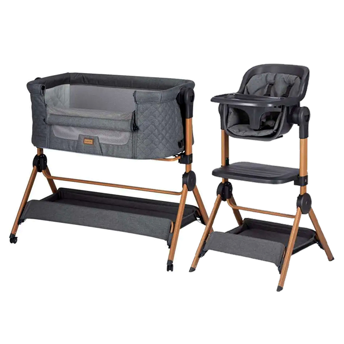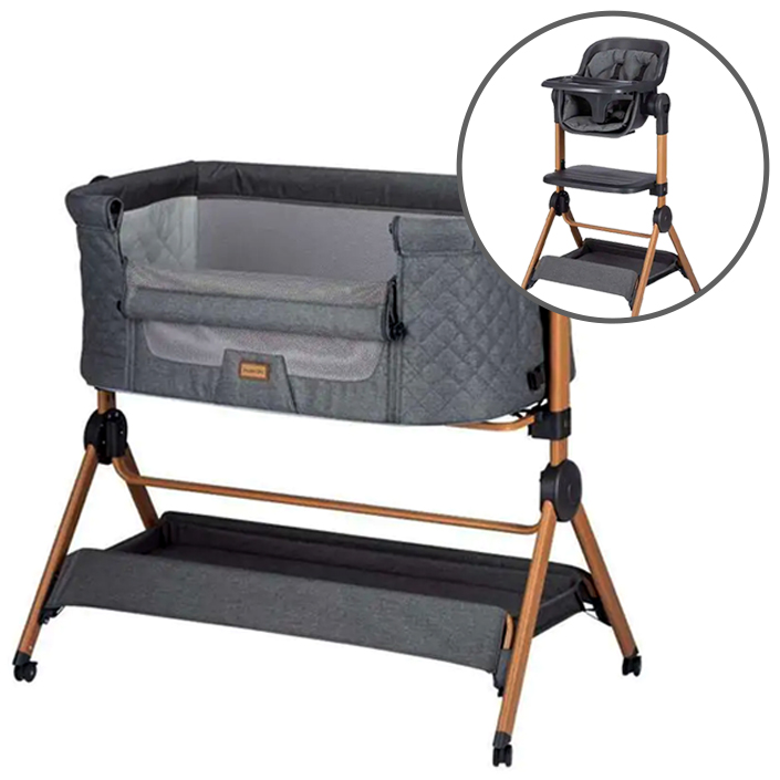 Přídavná postýlka 2v1 se snadno přemění na vysokou židli, má kolečka, nastavitelnou výšku, otevíratelnou bočnici a 5-bodový pás. Židle obsahuje polštář, odnímatelný podnos a úložný prostor pro příslušenství.
