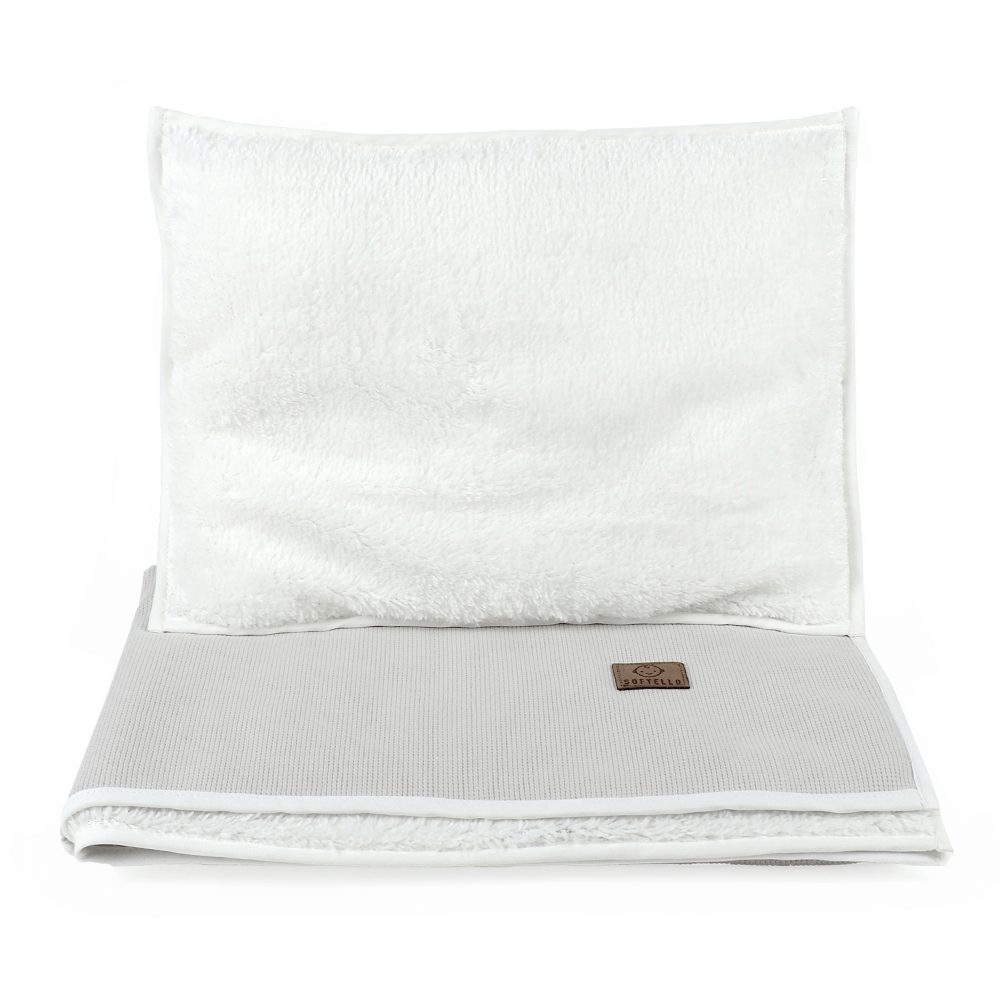 Set polštář+přikrývka v světle šedé barvě je vyrobena z měkoučkých bavlněných vaflí a druhou stranu tvoří jemňoučká bavlěná sherpa. Je vhodná k přikrytí vašeho děťátka zejména během chladnějších dnů, například během odpoledního spánku v postýlce, kočárku či autosedačce.