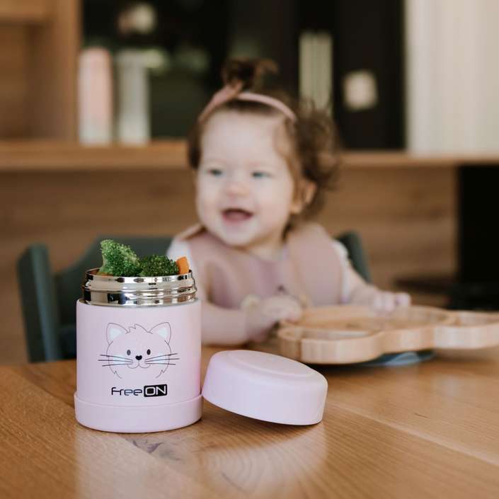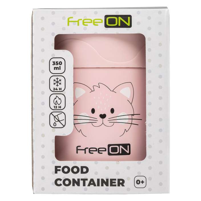 Termobox na jídlo od zn. FreeON v designu růžová kočička využijete při výletech s děťátkem v kočárku nebo při delších cestách. Nádoba pojme až 350ml obsahu, snadno se otevírá a zavírá a velmi dobře těsní. Termobox je vhodný pro použití po celý rok. Můžete jej naplnit teplým i studeným obsahem. Díky dvojité stěně z nerezavějící oceli si obsah nádoby udrží svoji teplotu po dlouhou dobu, teplý až 12 hodin a studený až 24hod.